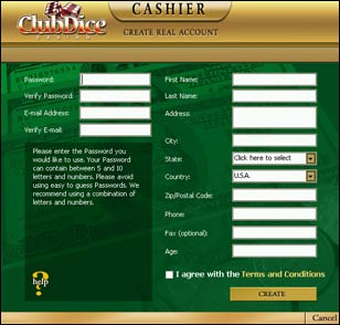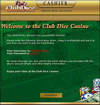 - Wait to receive a reply from our server with your Club Dice Casino Play For Real Money Username and Password. Be sure to write them down and then press "OK".