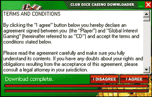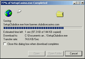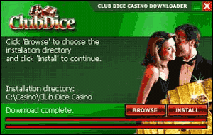 - You will now see the Club Dice Casino Installation Wizard. The Wizard will begin downloading the Club Dice Casino software. This should take about 10-12 minutes if you are using a standard 56KB/sec Modem.