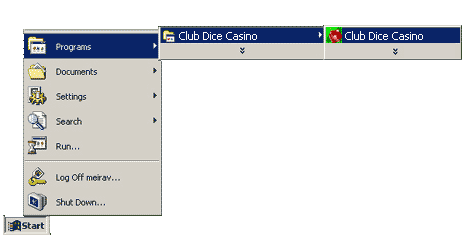 If you cannot see the Club Dice Casino icon, go to the Start menu at the bottom left corner of your screen. Choose "Programs" => "Club Dice Casino" => "Club Dice Casino" as demonstrated below: