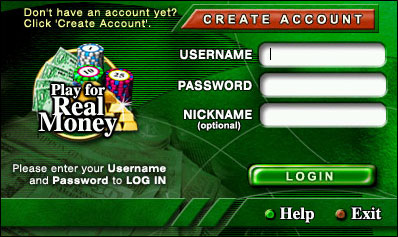 - You will be automatically returned to the Login screen. Enter your Club Dice Casino Play For Real Money Username and Password. You may also enter a Nickname, if you wish. Your Nickname will appear as your on-screen alias, viewable by other players. Press "Login".